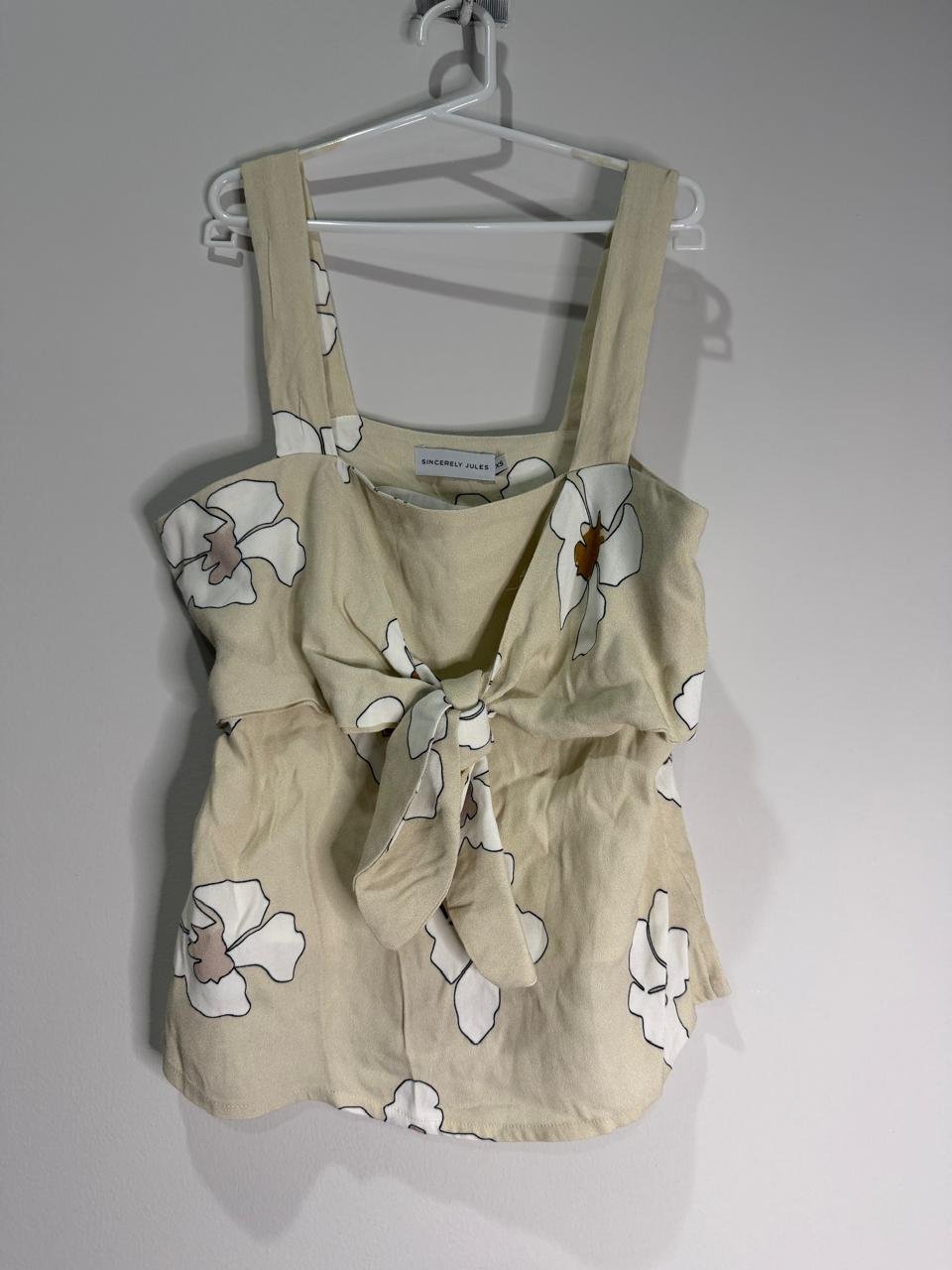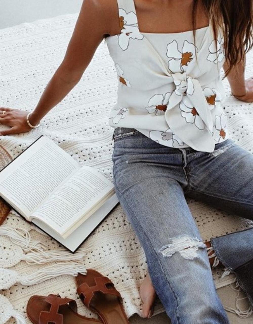 Blusa estampada de Sincerely Jules con amarre frontal. Fresca, ligera y perfecta para looks relajados pero bien armados.