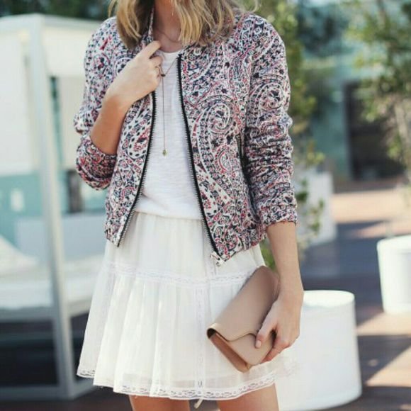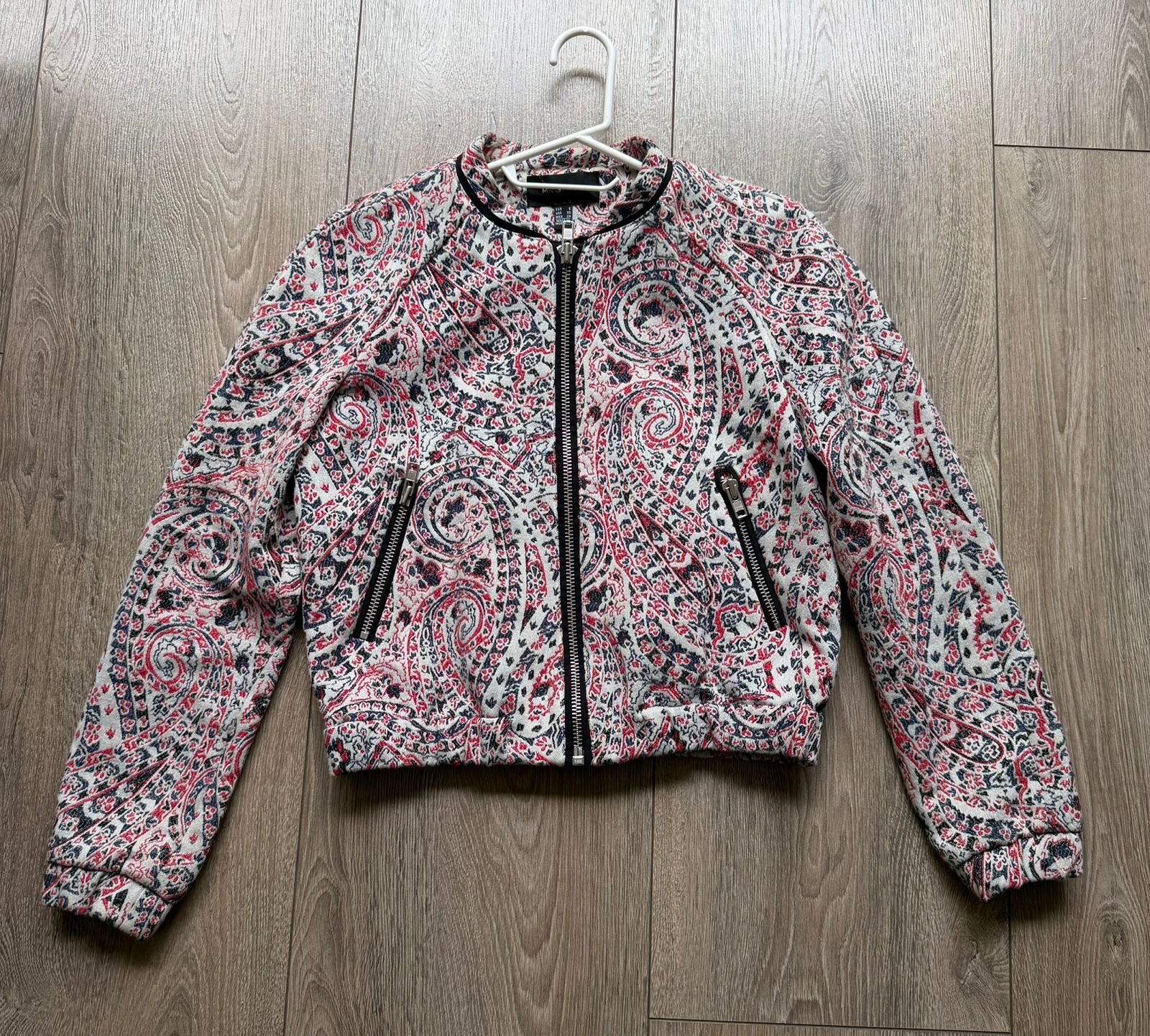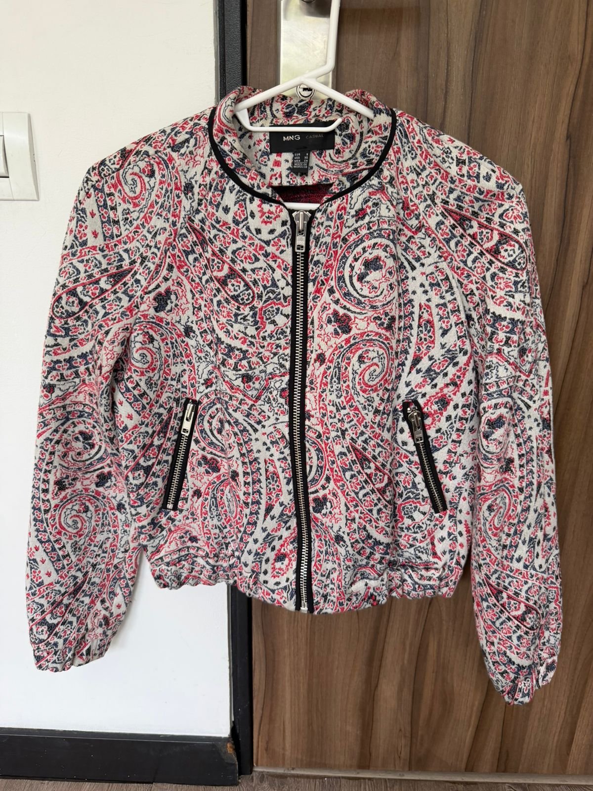 Chaqueta tipo «bumper» de MANGO con un vibrante estampado paisley. Una prenda ligera y moderna, perfecta para añadirle estilo a un look casual o protegerte con elegancia en días frescos.