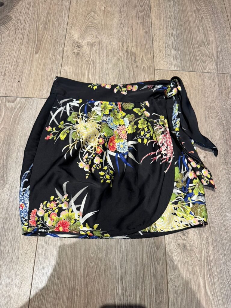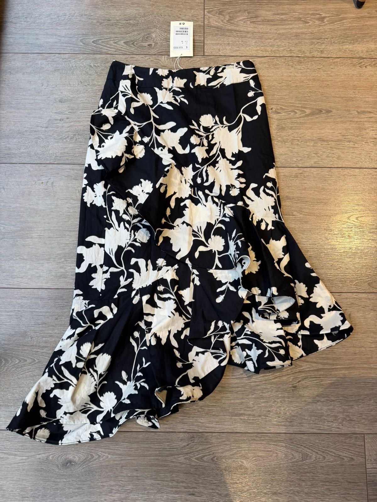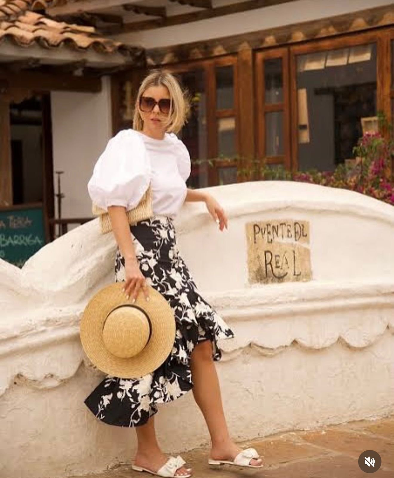 Exclusiva falda de la colección cápsula H&M x Johanna Ortiz. Un diseño romántico con estampados botánicos y boleros asimétricos que capturan la esencia del lujo tropical.