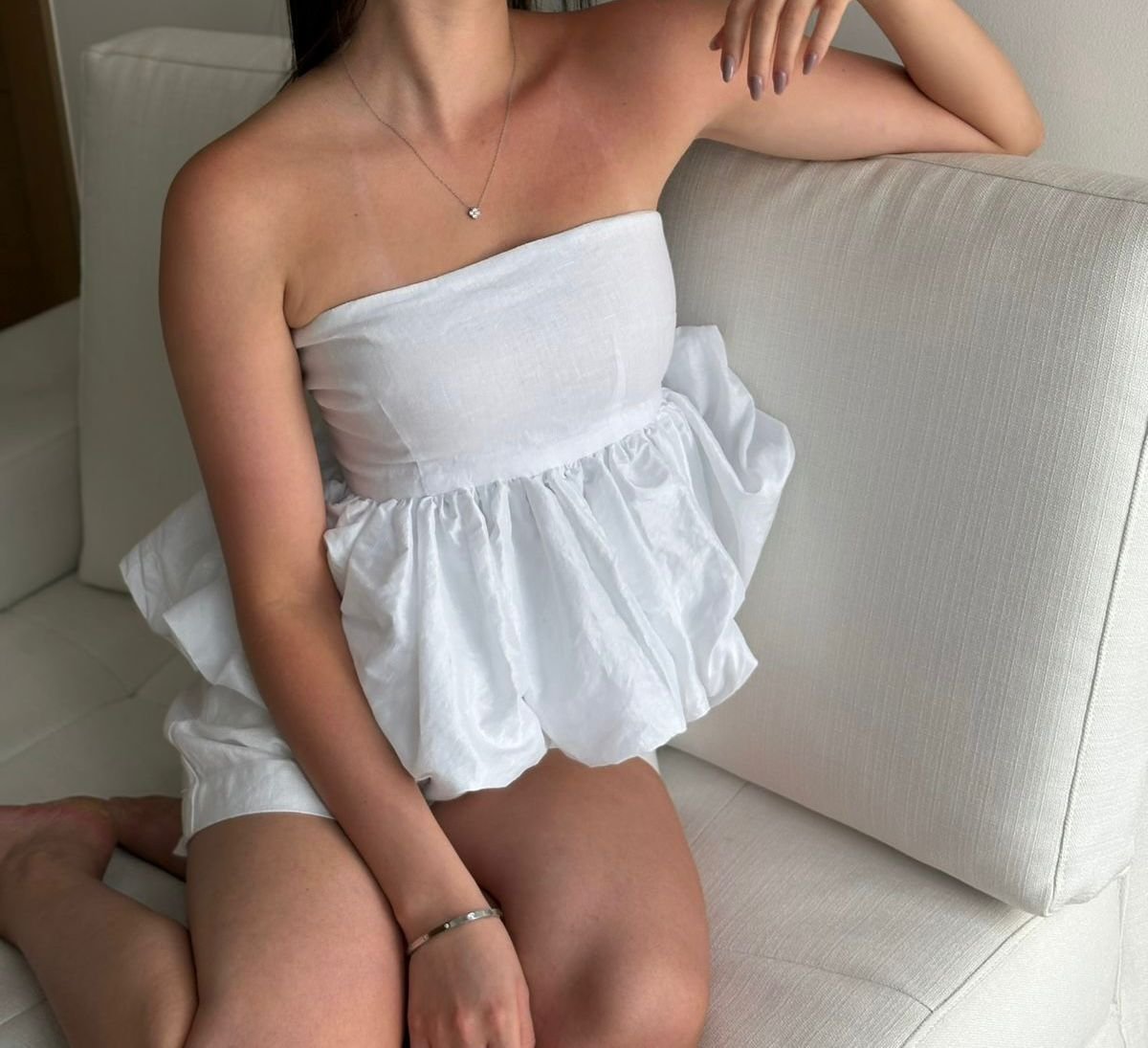 Encantador top strapless confeccionado en lino de alta calidad. Con un diseño atemporal en tonos blanco y sepia, esta prenda destaca por su versatilidad y su sistema de ajuste total en la espalda, ideal para un calce perfecto.