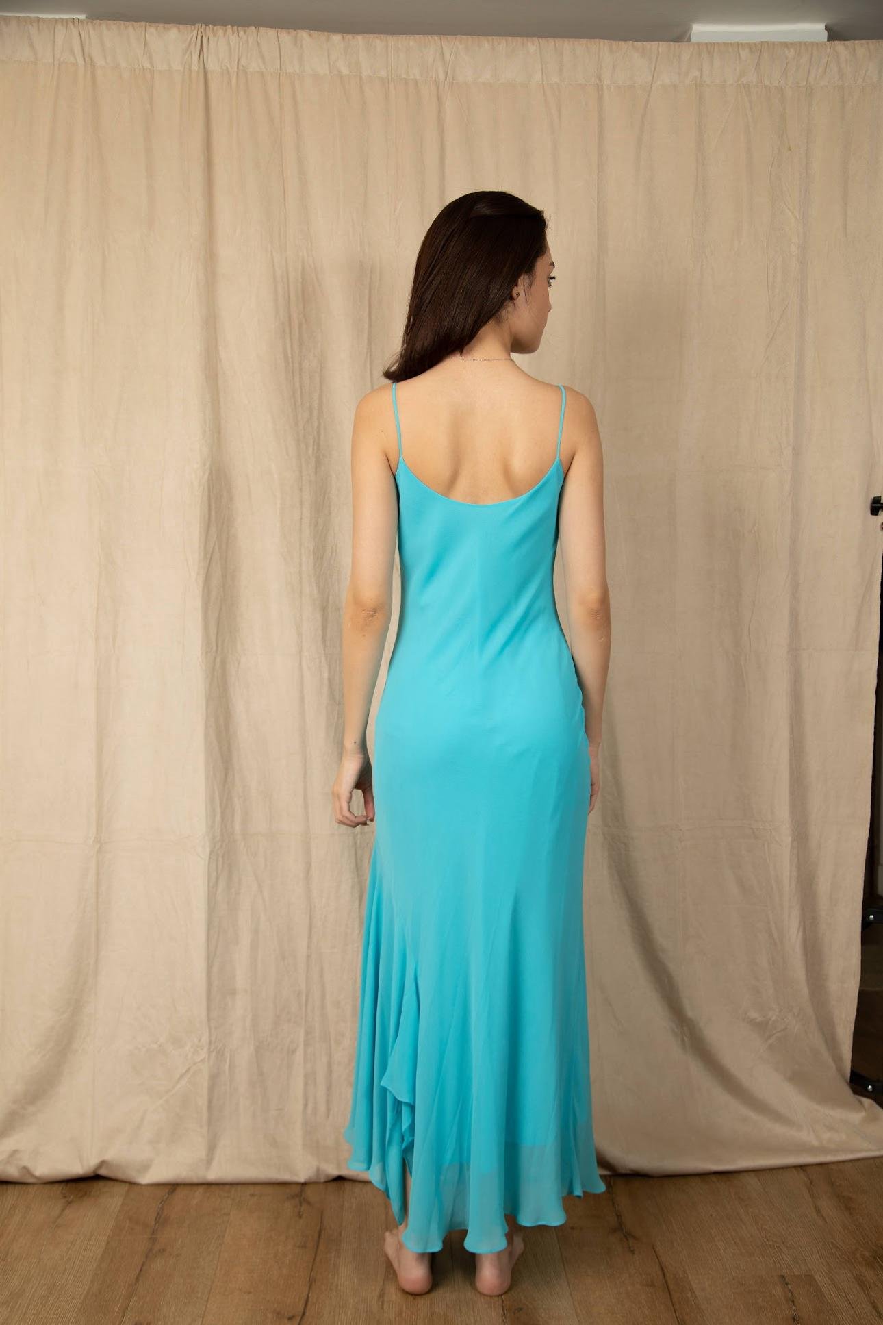 Vestido satin largo aguamarina del diseñador Durh