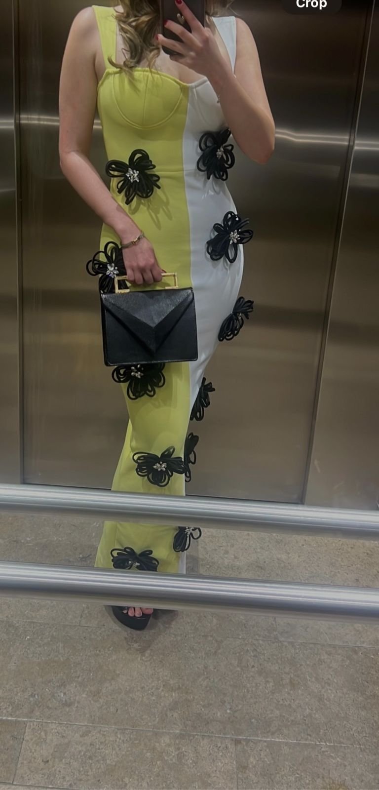 Espectacular vestido de fiesta tipo bandage con un elegante diseño de flores negras. Su tejido de alta compresión moldea y realza la figura, ofreciendo un look sofisticado y glamuroso para tus eventos más especiales.