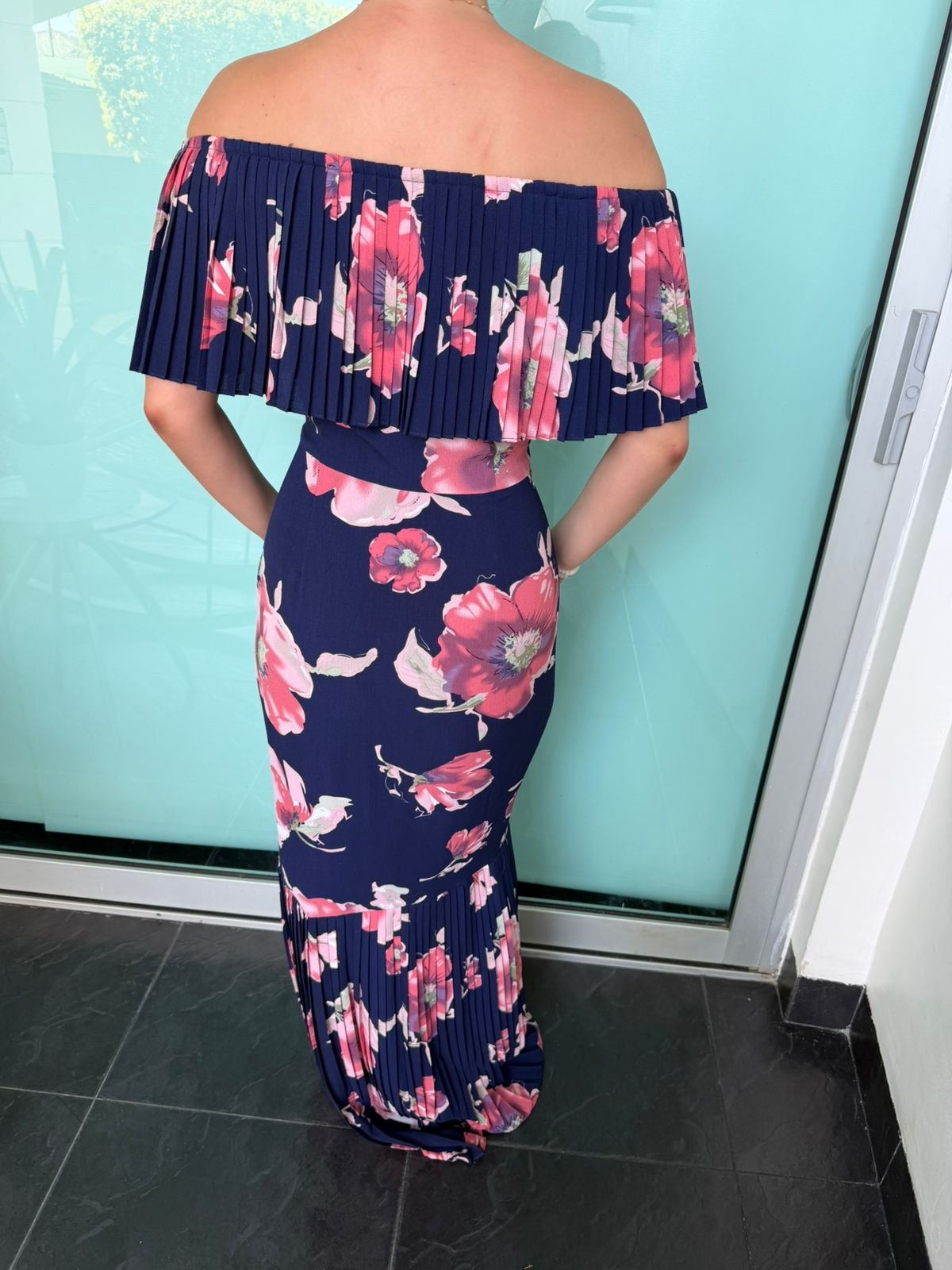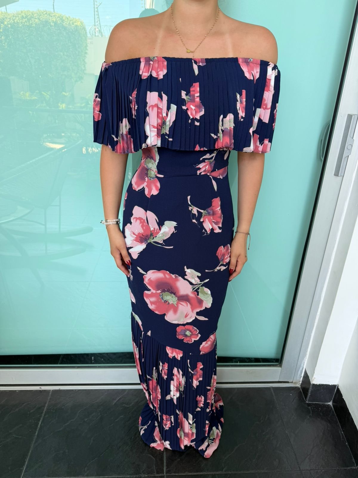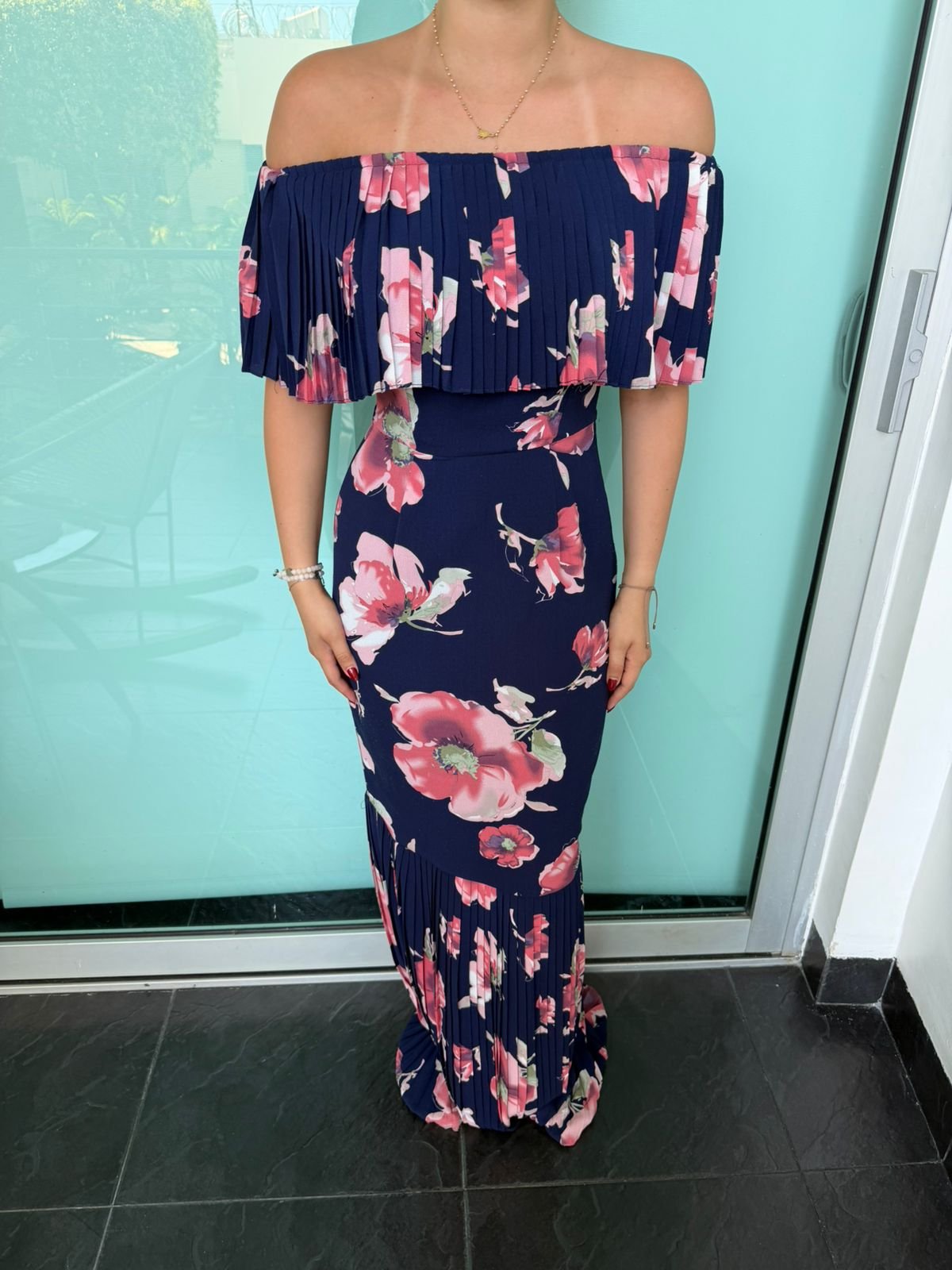 Espectacular vestido largo Azulu con diseño off-shoulders y detalles plisados. Su estampado floral sobre fondo azul oscuro ofrece un aire romántico y sofisticado, ideal para eventos de día o tarde.